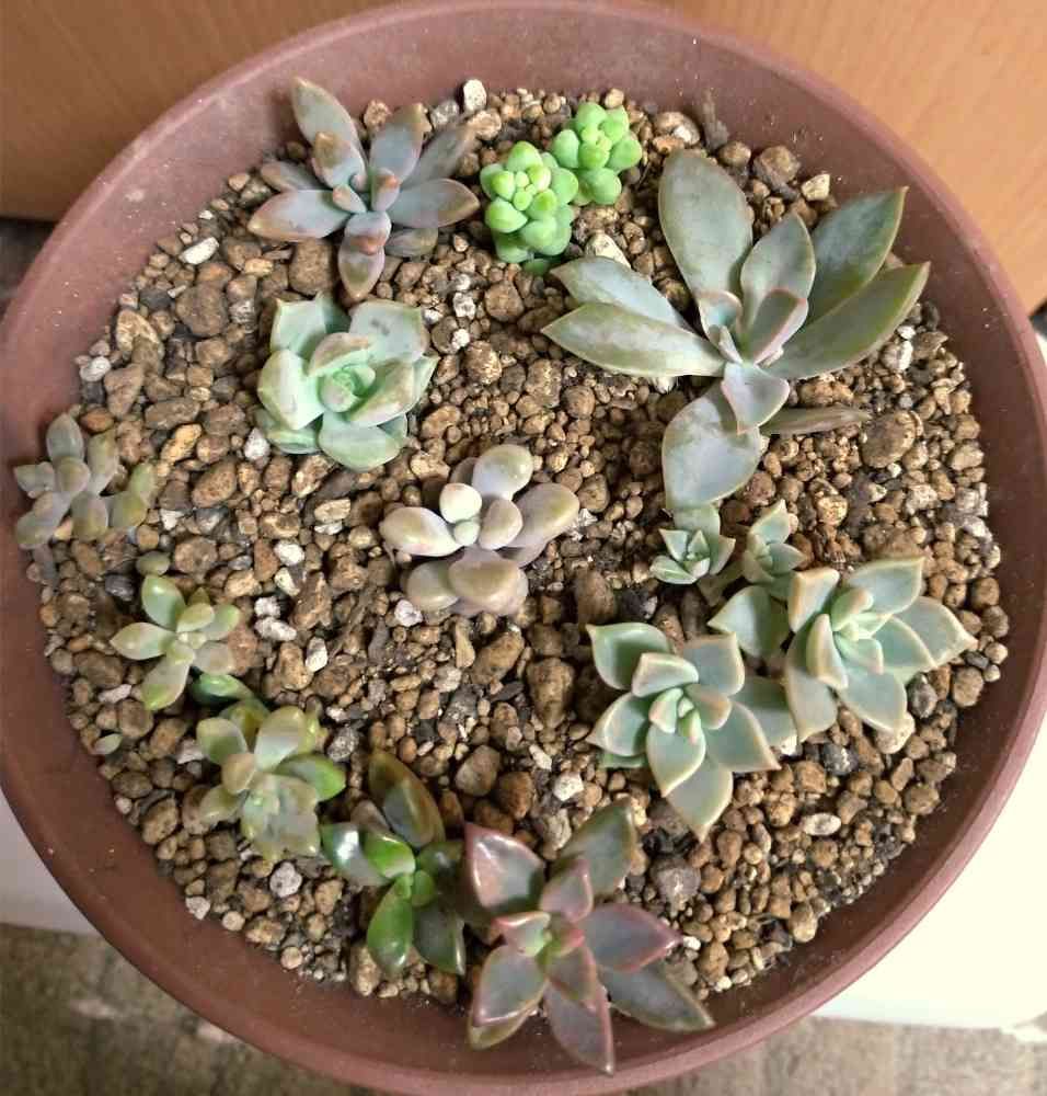 上のほうの若葉色のはビアホップ(新玉つづり)、ど真ん中でぷくぷくしてるのがだるま秀麗、中央下ややピンクなのがブロンズ姫ではないでしょうか?