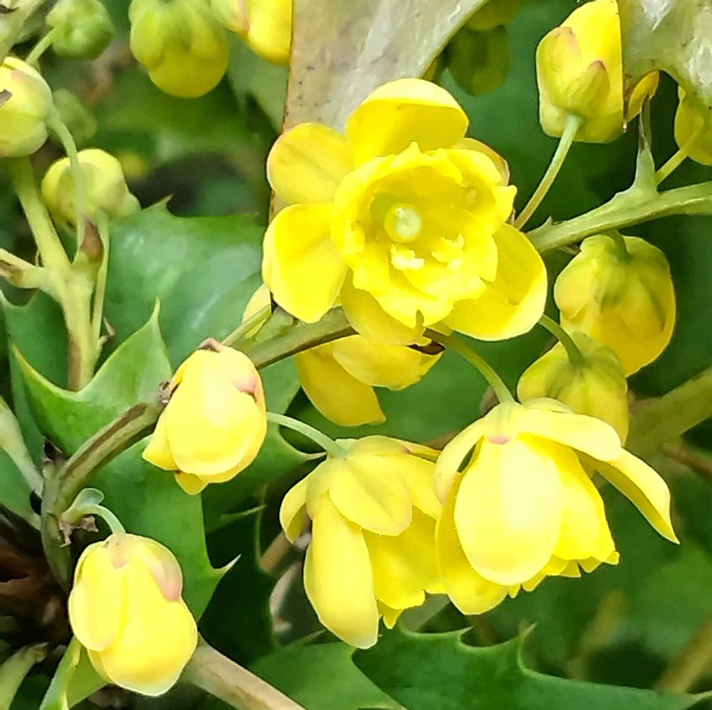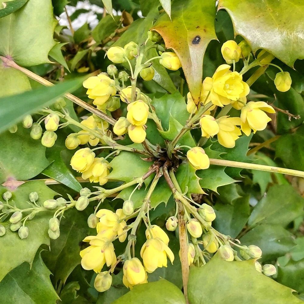 葉っぱの細いホソバヒイラギナンテンの花は12月頃に咲くので、これも春の兆しでしょうか❣️
