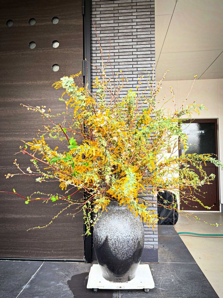 出張生け込み なげいれ 枝物メインでとのオーダーだったので 桜やミモザ コデマリなど 今の季節感を意識した広がりのある作品に仕上げてみましたm(__)m