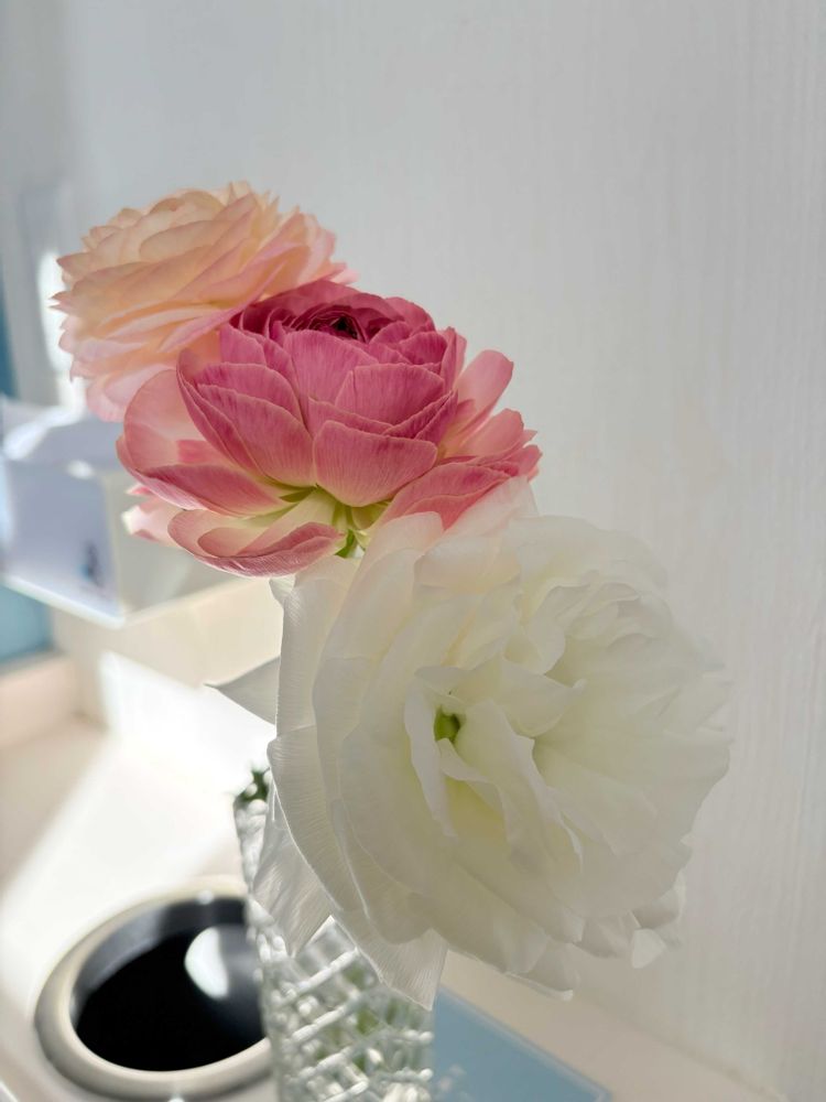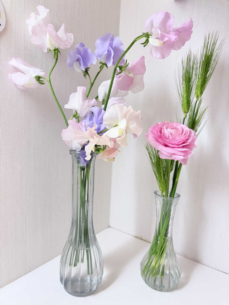 このスイートピーとラナンキュラスの色が淡くて可愛いよね💕"(∩>ω<∩)"