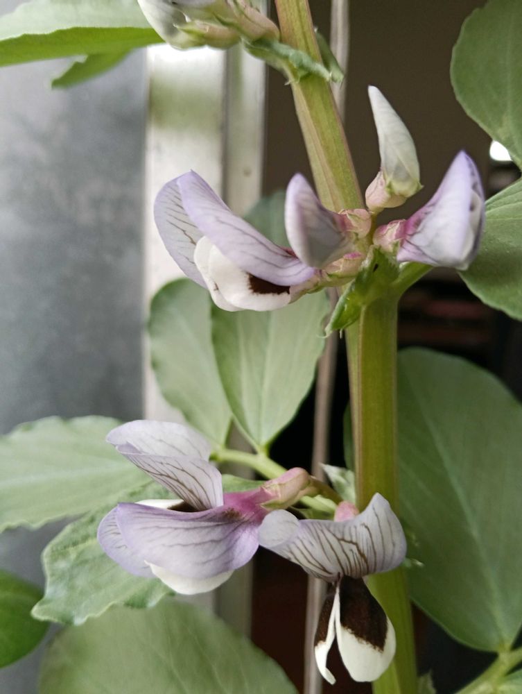 窓辺でグリーンカーテン ぽく育てている そら豆ちゃんのお花が咲きました。