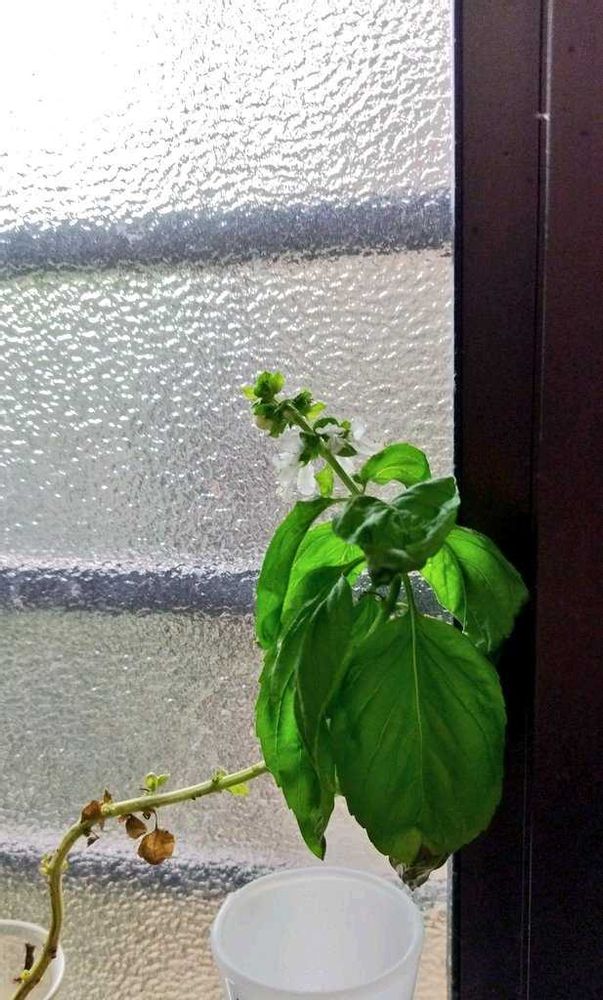 キッチン水差しで冬越ししたバジルが咲いてます😃