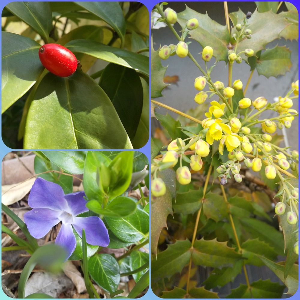 ④アオキの実、ツルニチニチソウ、ヒイラギナンテン