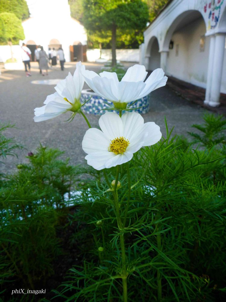 テーマパークに夕方が近づき,そろそろ16:40。今日は楽しかった,ありがとうと言うことで。白いコスモスも素敵でした。