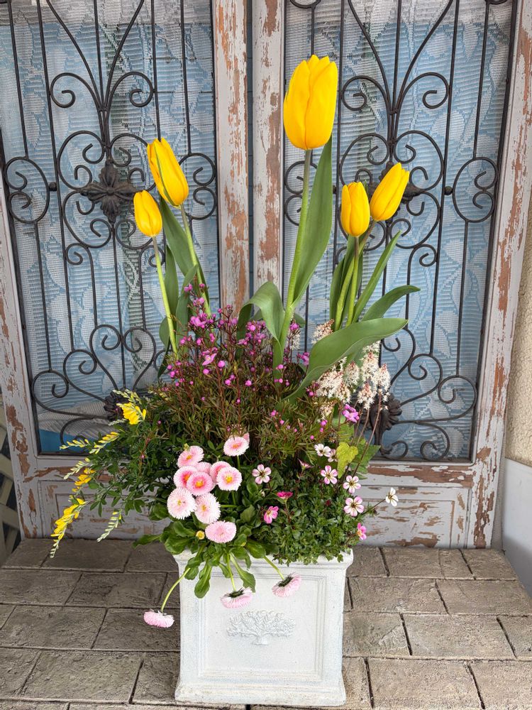 チューリップはすぐ終わってしまうけど、その後も楽しめる寄せ植えです😀