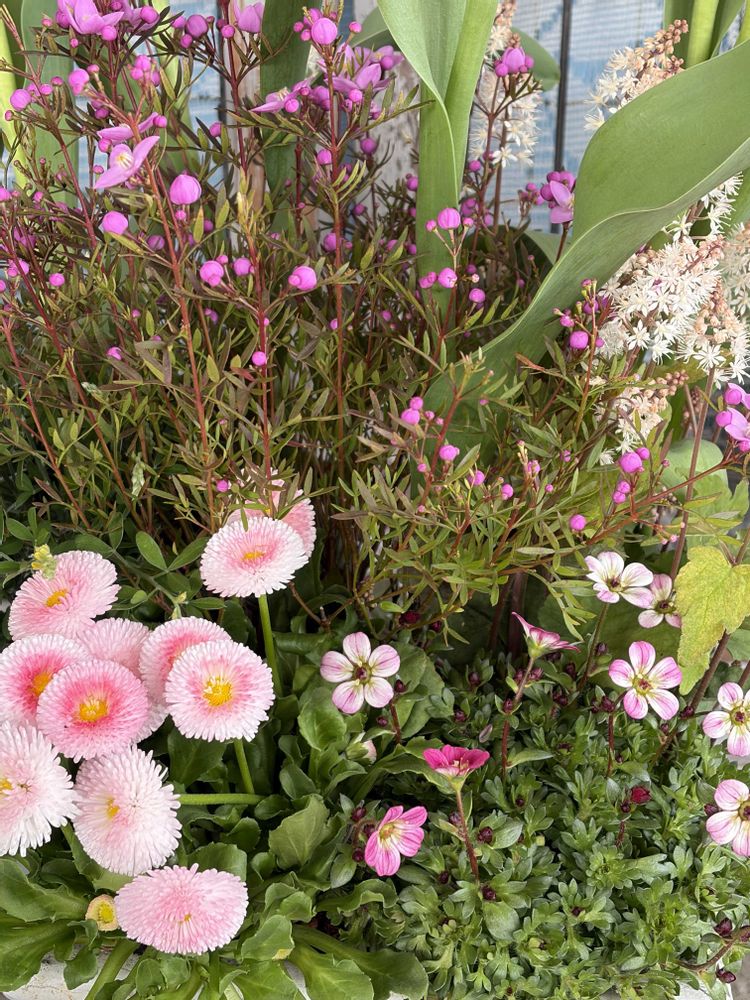 花付きエニシダを手前にするつもりが、先生が後ろ側に入れてくれて、デージーとクモマグサを手前に🌸