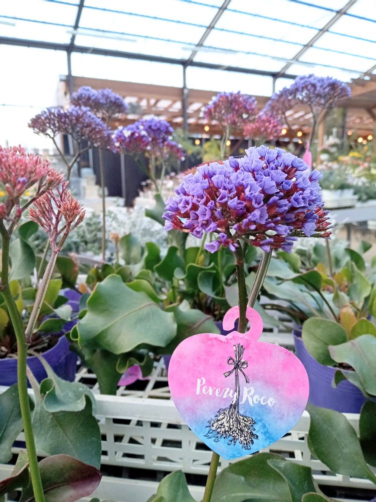 イソマツ科イソマツ属の1年草"スターチス"別名"花浜匙(はなはまさじ)","庭花火(にわはなび)"は,花の様に見える部分は萼で,花は中心の白色部分です。この萼がブラシの様に横に並ぶタイプと,小花を散りばめた様に咲くタイプとがあります。最近は,細い枝が細かく枝分かれし,萼が大きなタイプが出回っています。カサカサと乾いた風合いが特徴の花ですが,それはケイ酸を含んでいるからです。その為,乾燥させても色も形も殆ど色褪せずに楽しめるので,花言葉「永遠に変わらず」もこれに由来します。ドライフラワーとしても人気ですよね。以前は,学名がスターチスでしたが,現在はリモニウムです。ギリシャ語で「海浜」を意味しますが,元々浜辺に自生する植物だった事に因みます。花名は,やはりギリシャ語の「statizo(止める)」が語源。その理由は,なんと,この花には下痢止め効果があったからだそうです。花色でも花言葉が違い,「しとやか(紫)」「永久不変(ピンク)」があります。