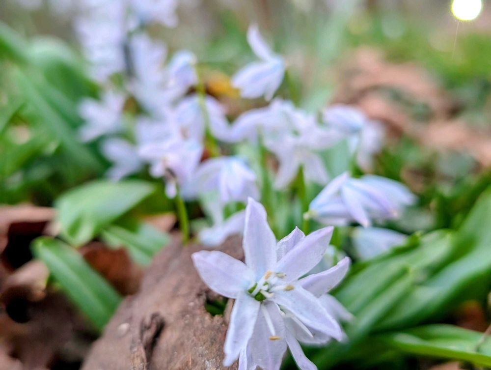 2枚目:森の裾に植えられたプシュキニア。落ち葉🍂押しのけて咲く花が華奢なのに力強い😆