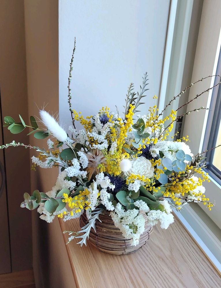 ③先月ワークショップで作った、ドライのミモザを使ったフラワーアレンジメント❇️✨💮✨💮✨❇️