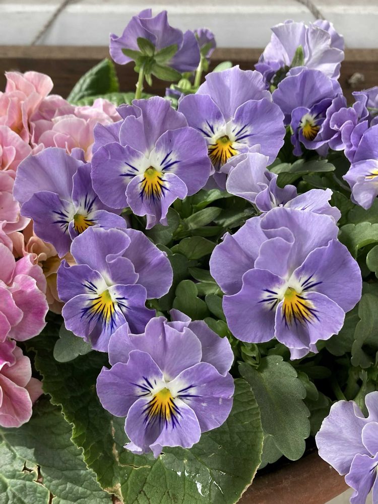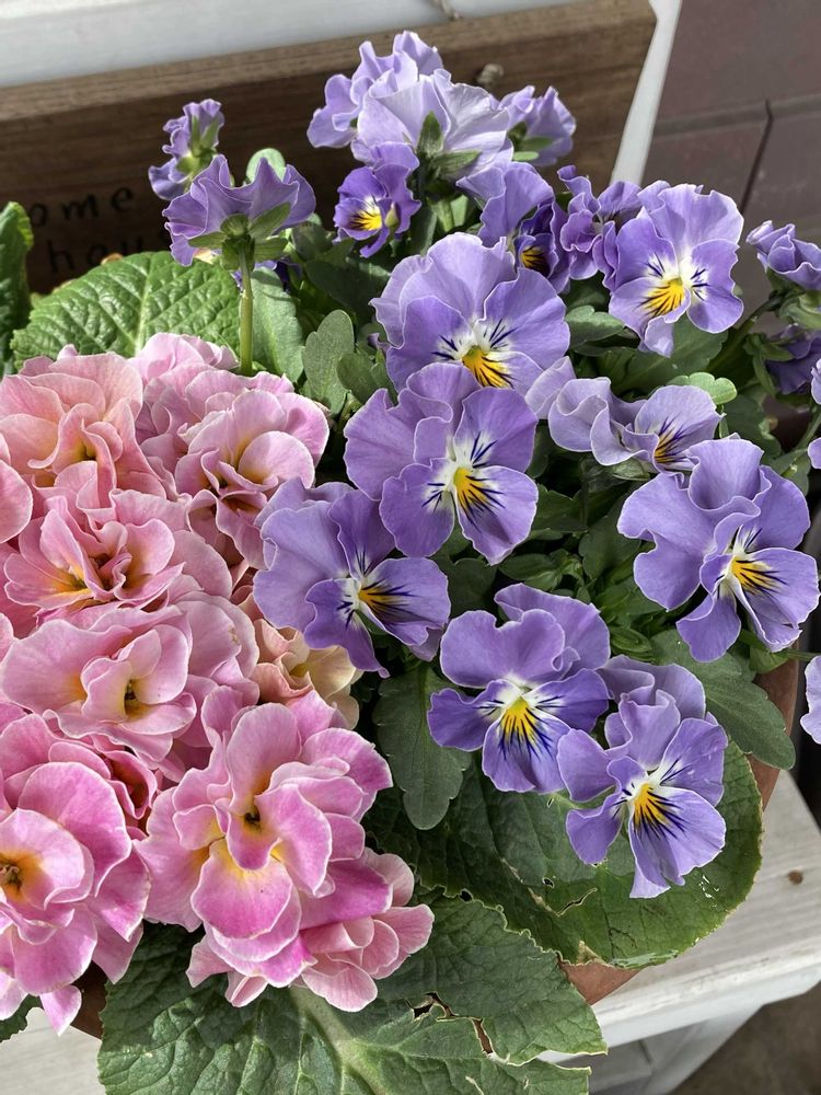 「プリムラジュリアン」と寄せ植えにしたビオラ「パスフリ」の花数が増えてきました🌸🌸🌸