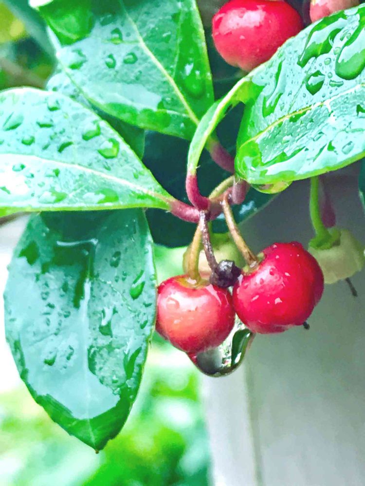 チェッカーベリーさん、随分赤くなりましたね〜😍😍😍しずくとセットでとってもかわいい〜💕💕うちのはなんだか赤くならないうちに実が少なくなっているような⁉️落ちちゃったかな〜😭😭