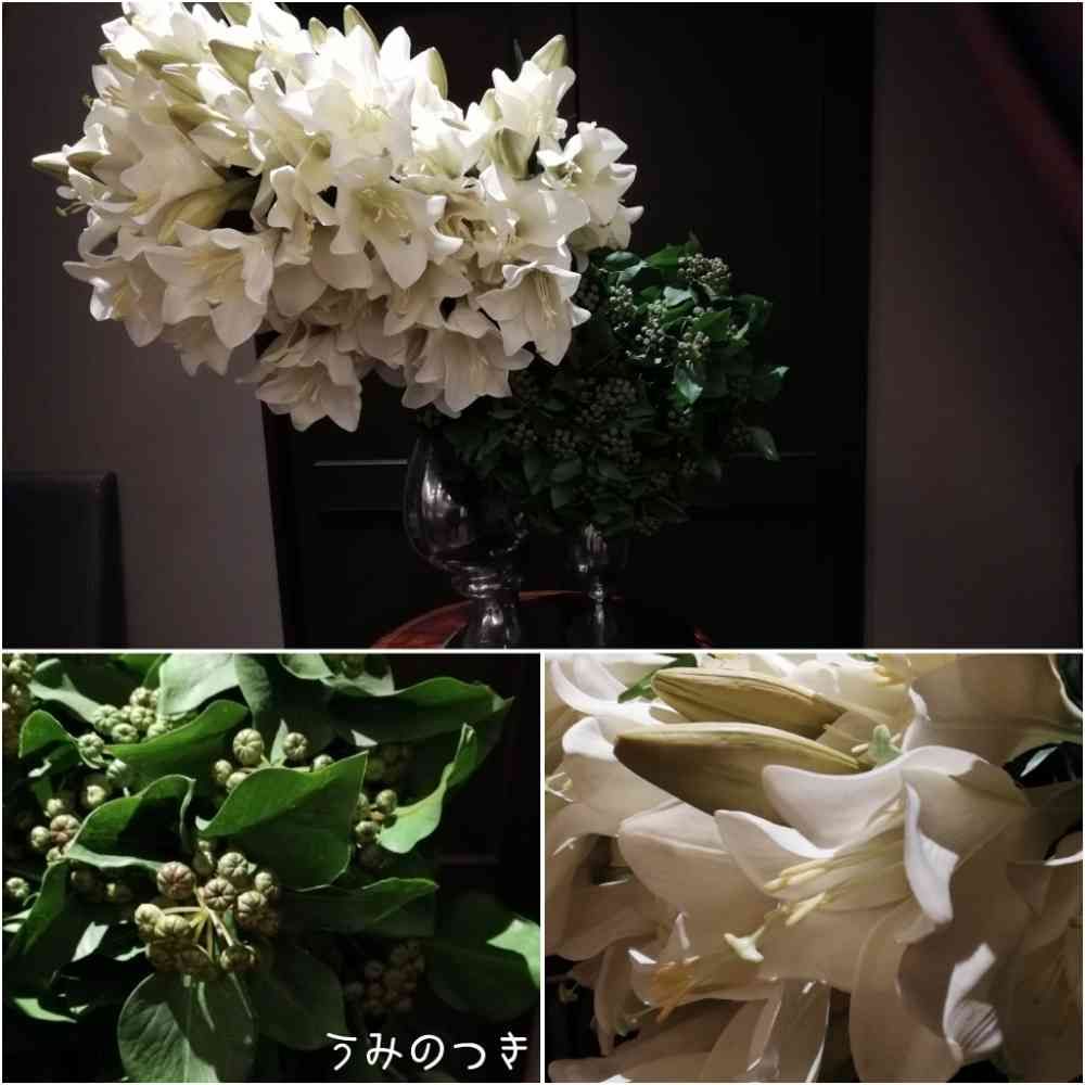 百合は緑色がかかっていて、お洒落な色でした、緑色の植物はなんでしょうか? 散らさず、まとめあって活けてあるところが、新鮮でした