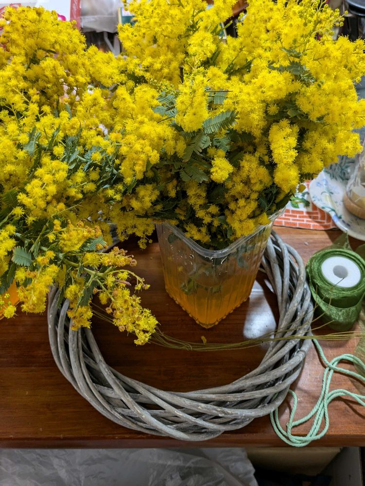 2日投稿のハーブ園で収穫してきたミモザ🟡でリースやブーケ💐を作りました☺️💕
