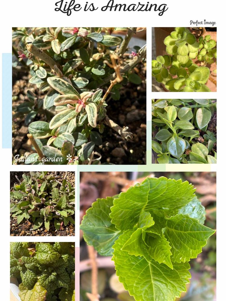 ③春になり色んな葉っぱが芽吹き大きくなってきて ↖️斑入りのキンギョソウのお花や↘️紫陽花ポージーブーケのお花が咲いてくれるのが楽しみです🎶💚💓