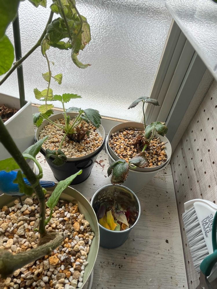 一方で大葉は茎の半分が黒く変色、イチゴはハダニのダメージが大きく瀕死状態、バジルは芽吹いたあと萎れて枯れ始める…