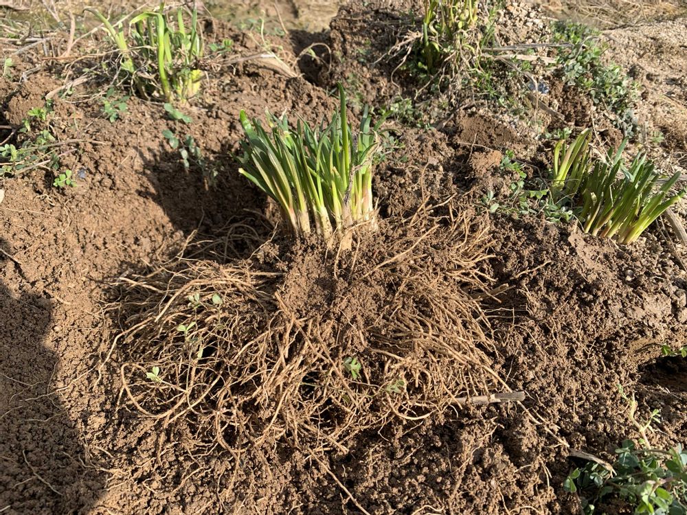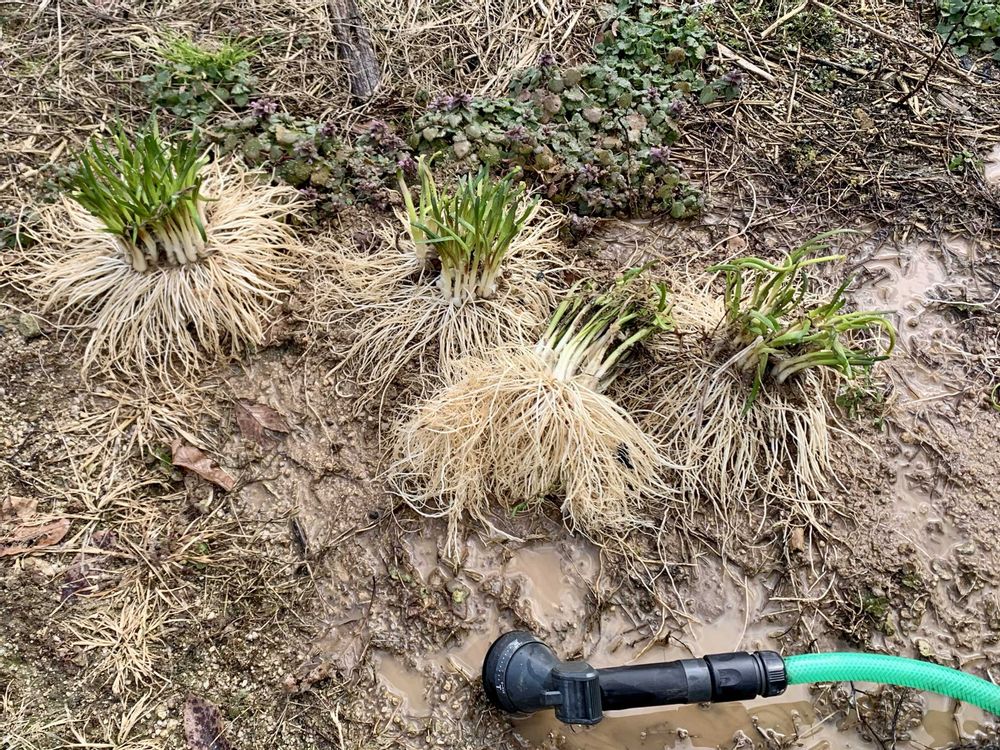 久しぶりの晴れ☀️で、やっと福寿草が花開きました😀花の咲いてる左手にも葉がいくつか出てますが、花芽が見えない💦去年の暑さが原因か❓💦去年から続いてるネギニラの植え替えを、早く畝を明け渡してもらいたいから強制大執行しました😅まだ土はだいぶ水分が残ってますねぇ😅根を痛めないよう水で洗い流しました😀時間が余ったのでニンニク🧄の追肥をしました😀