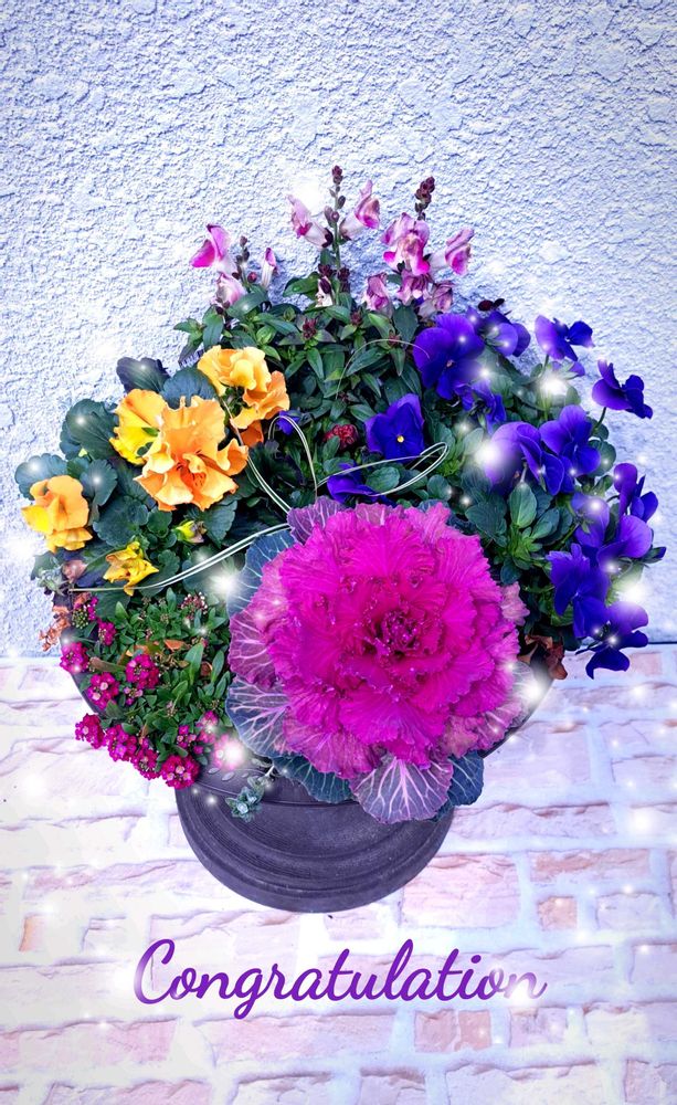 ①枚目…ワンパターンですが🤭玄関先で咲いている寄せ植えでお祝いさせて貰いますね~😍🎶
