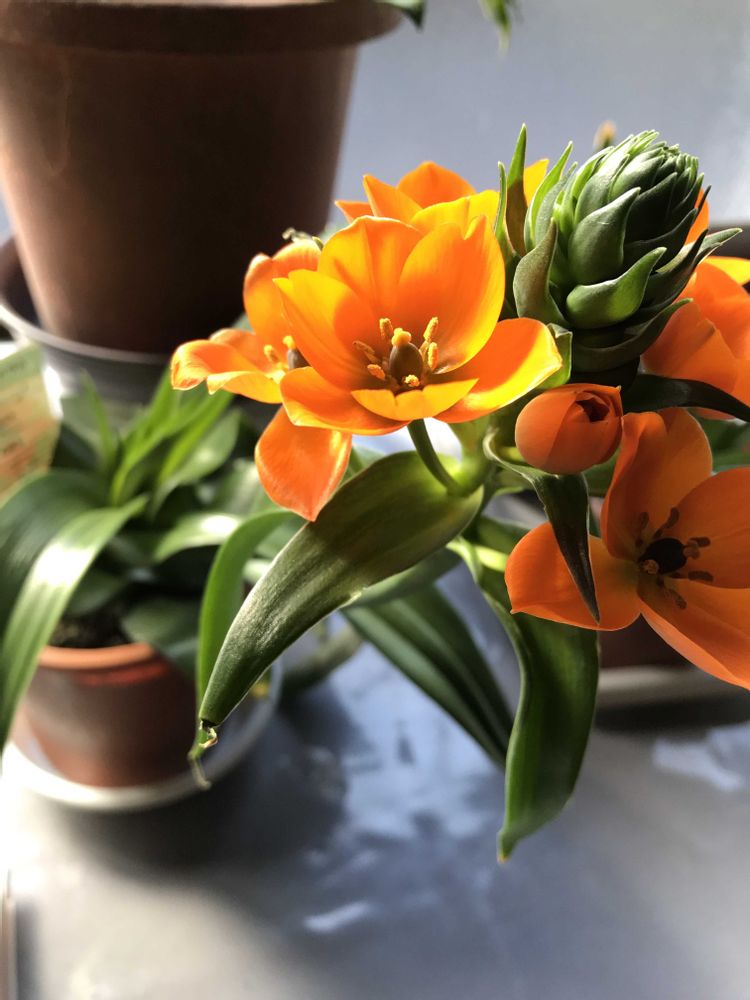 オーニソガラム、開花期3月〜6月頃今は窓🪟辺暖かくなったら木漏れ日の場所1本先終わったら軸を切り取る、切り取った隣りからまた花芽の付いた軸が出ます、長く長く楽しめます