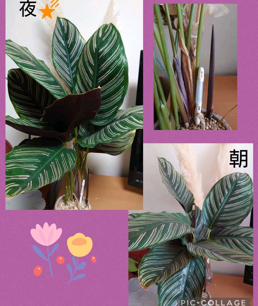 カラテアは夜になると葉っぱが立ち上がって昼間は元通りの開いた姿になります(就眠運動)
