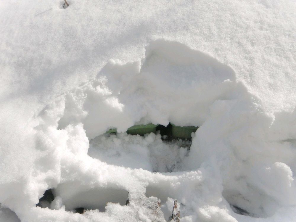 ③日が射して暖かかったので、例年より早くお庭の雪割りしてみました。チラッとプランター発掘❗