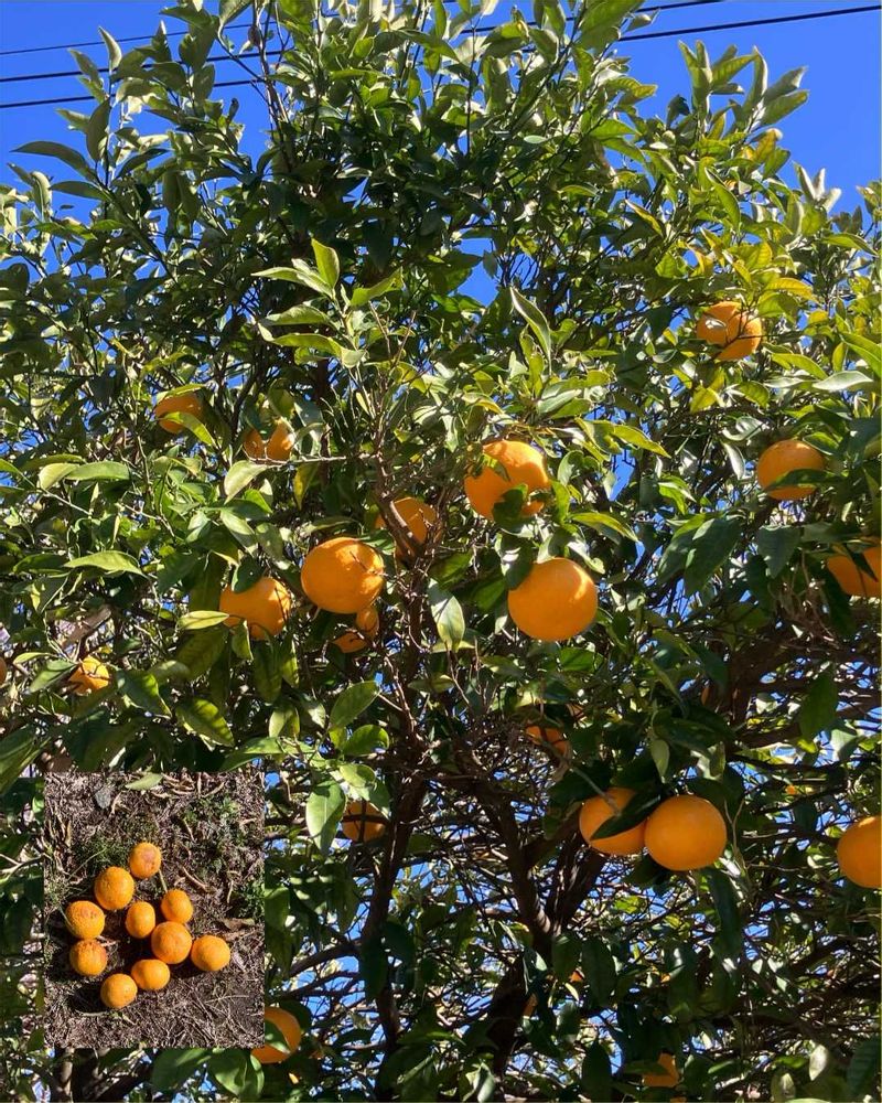 町内のお地蔵さんの前、川辺にある木風が強くて木下にたくさんの🍊が落ちてました😅