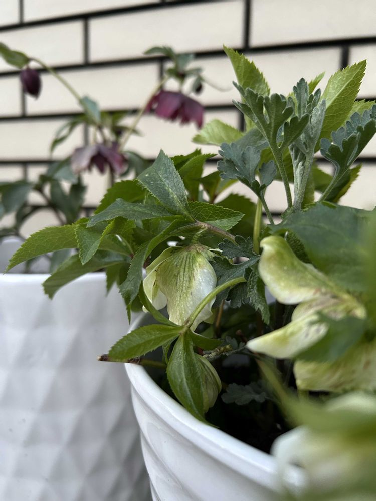 あちこちに地植えしていた白いクリスマスローズ。昨年鉢植えにまとめていたのも咲き始めています。奥の鉢は昨年お迎えしたもの。