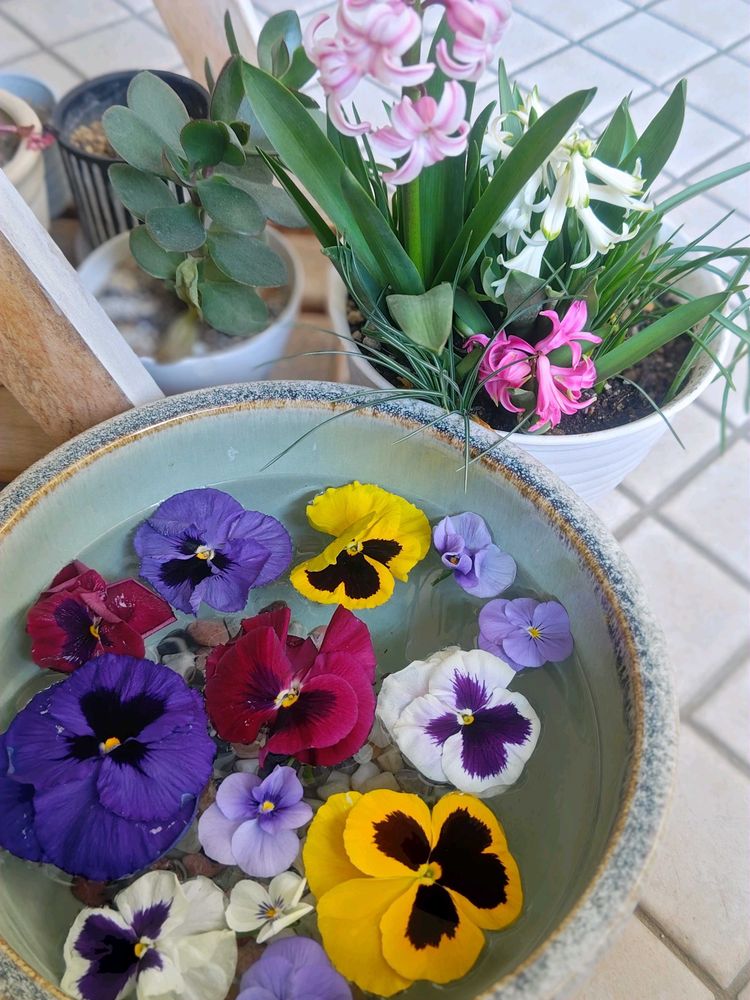 寄せ植えやハンギングバスケットの中で次々と咲く、パンジーやビオラ。切り戻しでカット✂️した花で、なんちゃって花手水。