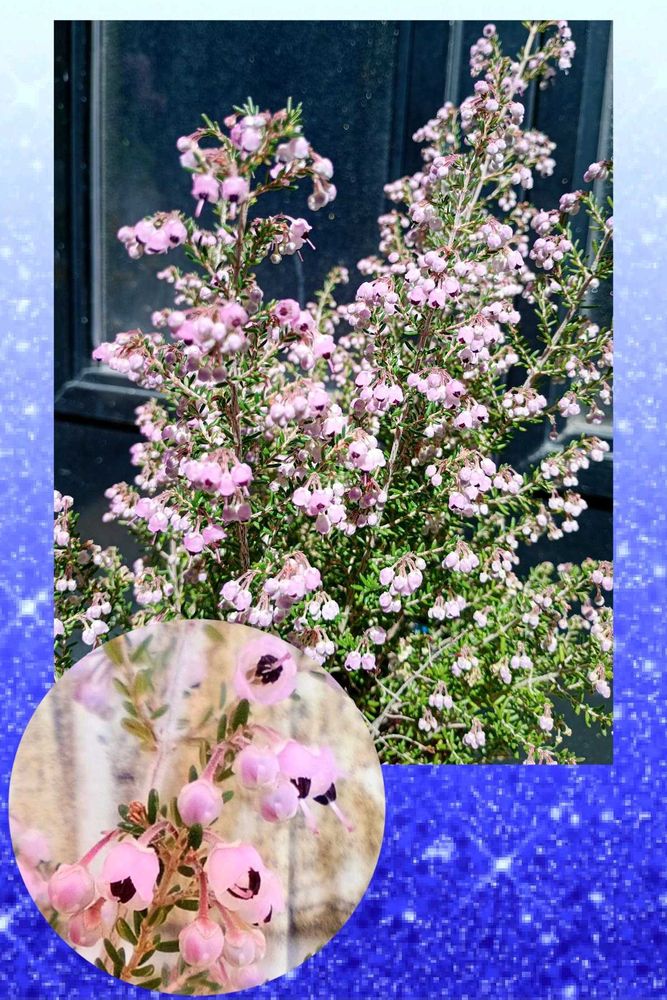③冬前にレスキュー価格だった、「ジャノメエリカ」。迎えた時は、全体的にグレー🩶。初めての植物🔰🤔、ダメ元で玄関外、ドア🚪脇で冬を過ごさせました。最近になり遠目からもピンク🩷っぽくなってきて、名前のように小さな花の中は黒っぽく⚫️やはり『蛇の目』💡なのね…の初体験🔰😄。