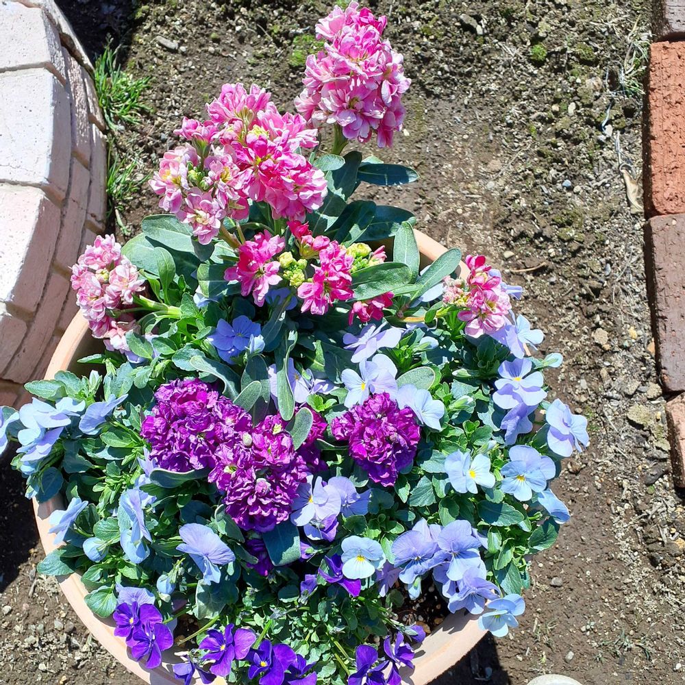 ①②寄せ植えのストックとビオラがモリモリになってきました🎵