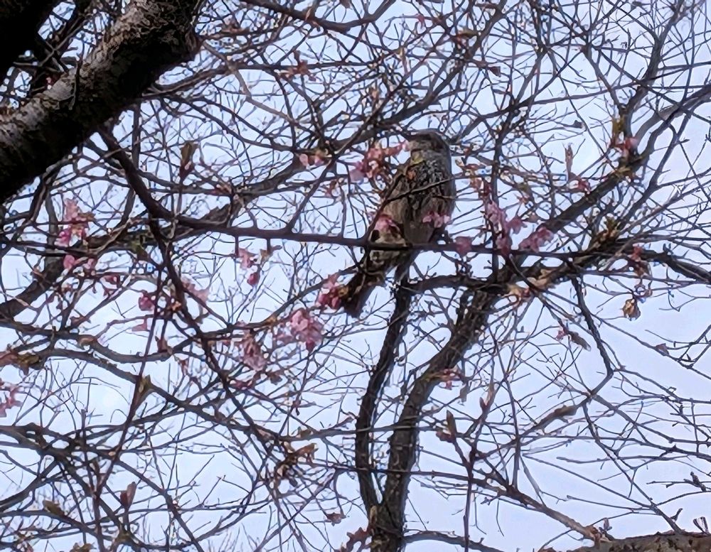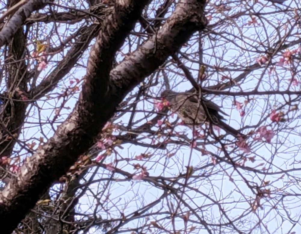 上に伸びて来ている河津桜にヒヨさん