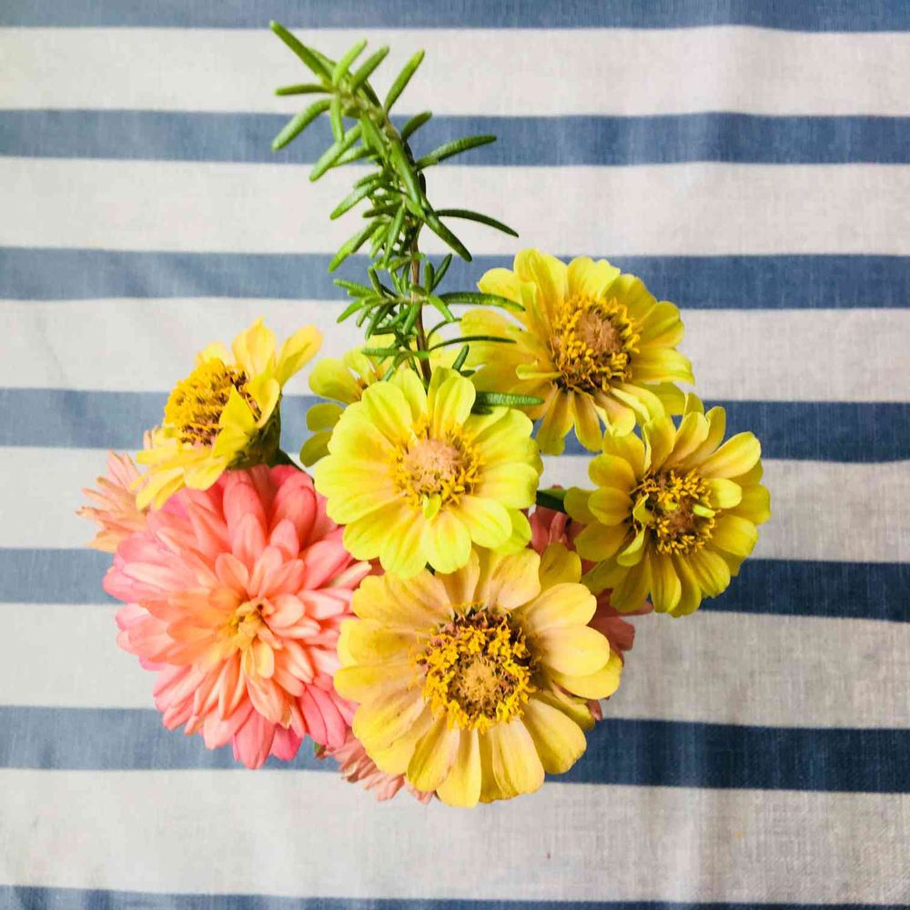 寄せ植えしてるジニア達がきれいだったので、飾ってみました。