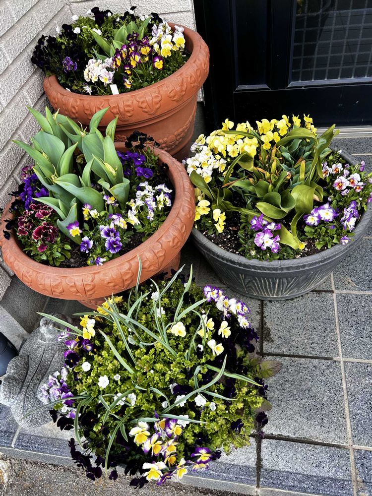 毎年3月末から4月の初めに玄関へ寄せ植えを移動させるのですが、今日先ほど移動してみました。