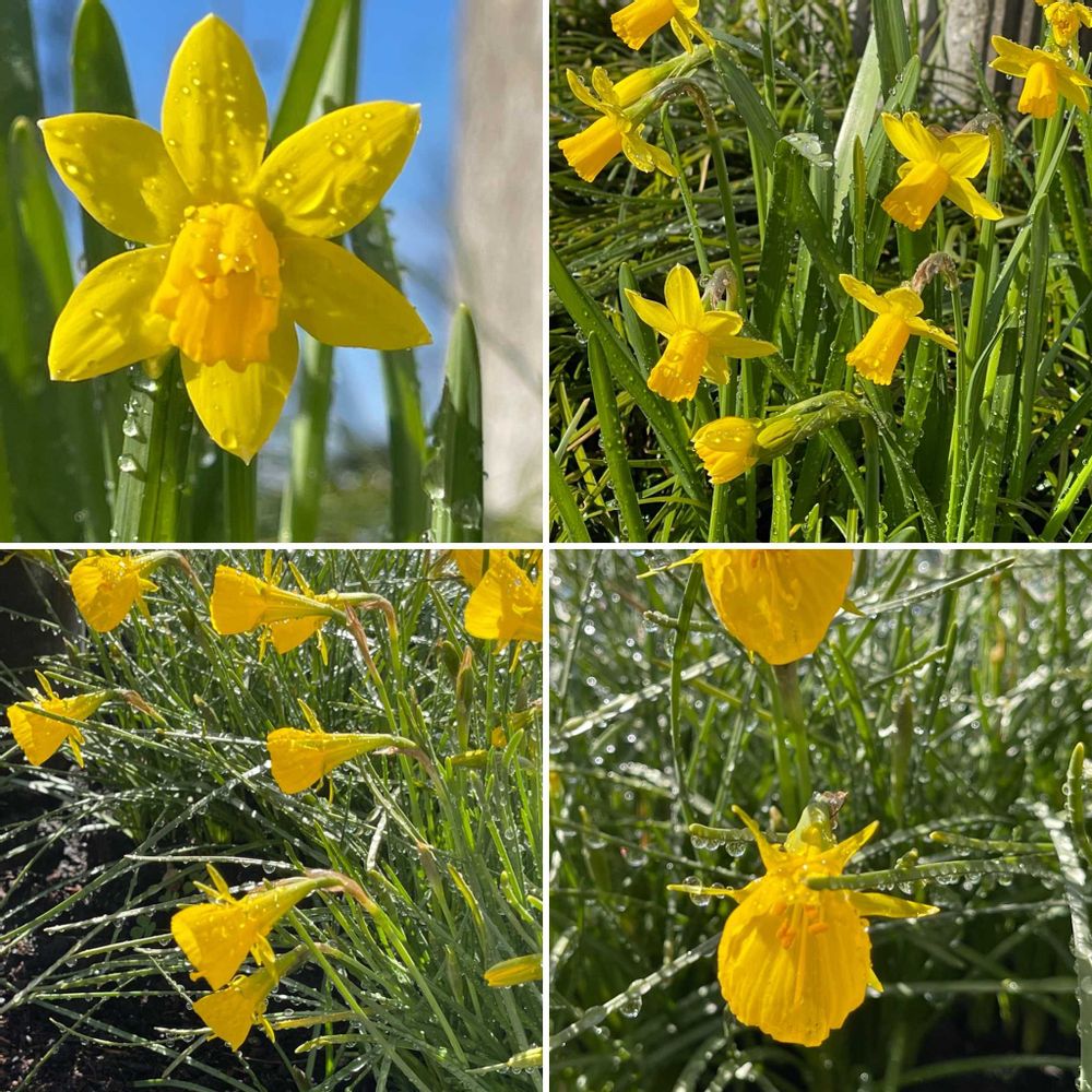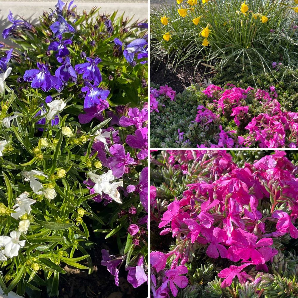暖かい朝、可愛く咲き始めました、スイセン、芝桜、ロベリア