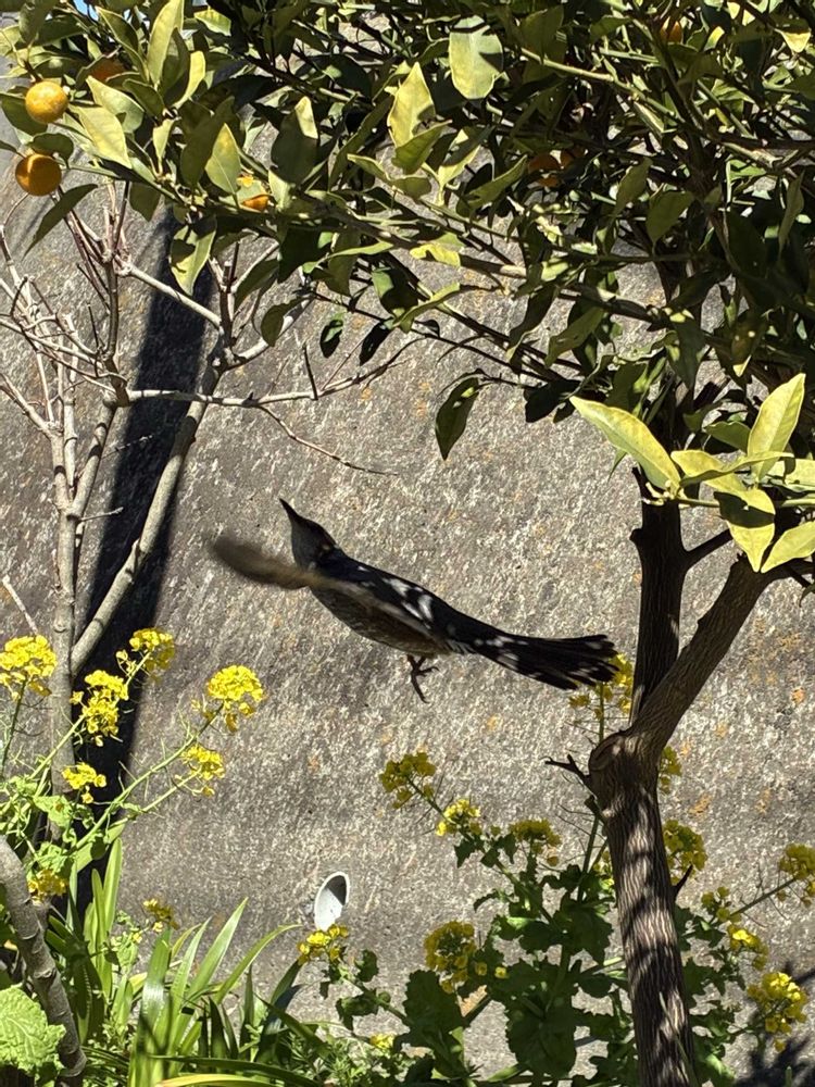 町内の人たちが管理している花壇かな?金柑の実がなっている木のかげにヒヨドリ見つけた!