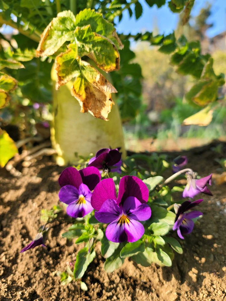 ❀大根の隣にこぼれ種からのビオラ💜長いこと咲いています✨