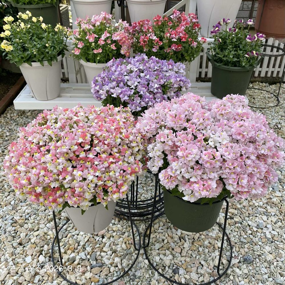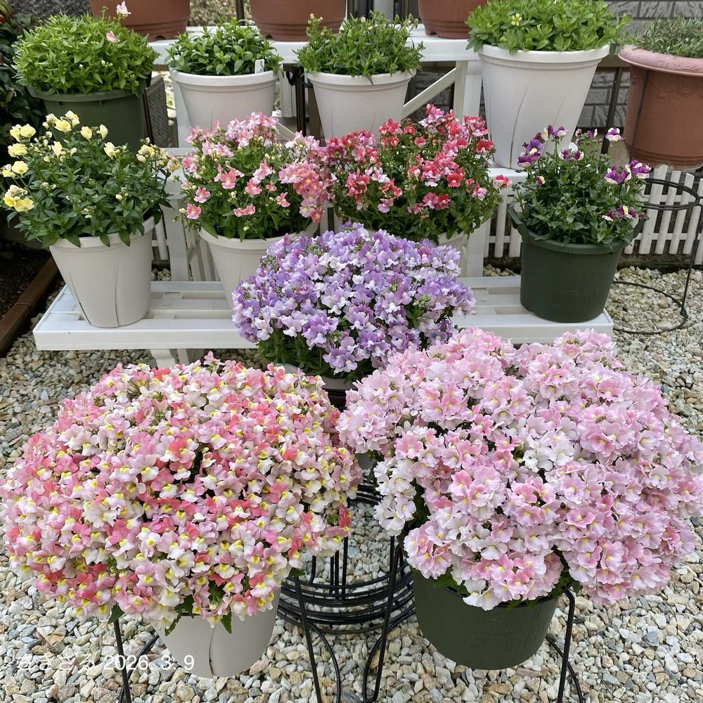 ちょっと頑張らせちゃった2年目の#ネメシアメーテルエレーヌ 🌱とあと一歩で満開の#ネメシアメーテルグッピー 🌱満開までもう少しかかりそうな#ネメシアメーテルミステリックブルー 🌱の3姫でわくわくの記念撮影をしてみました🐵🎶