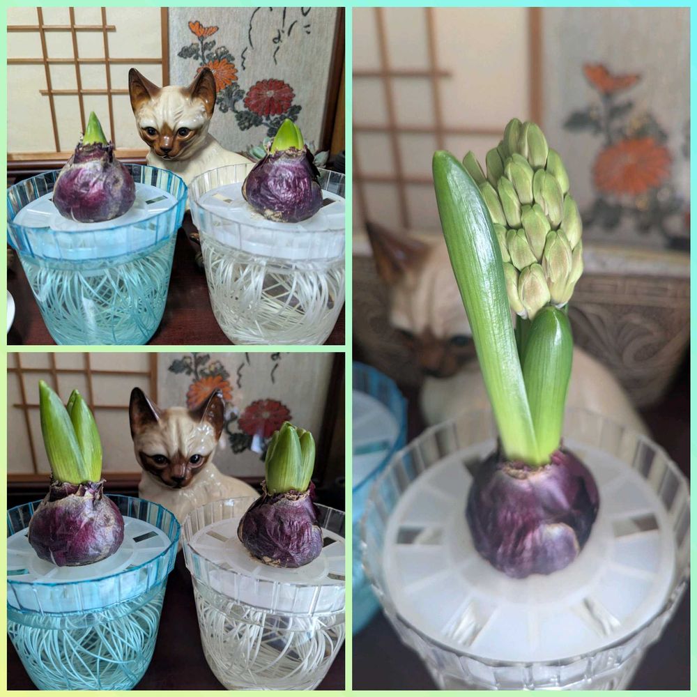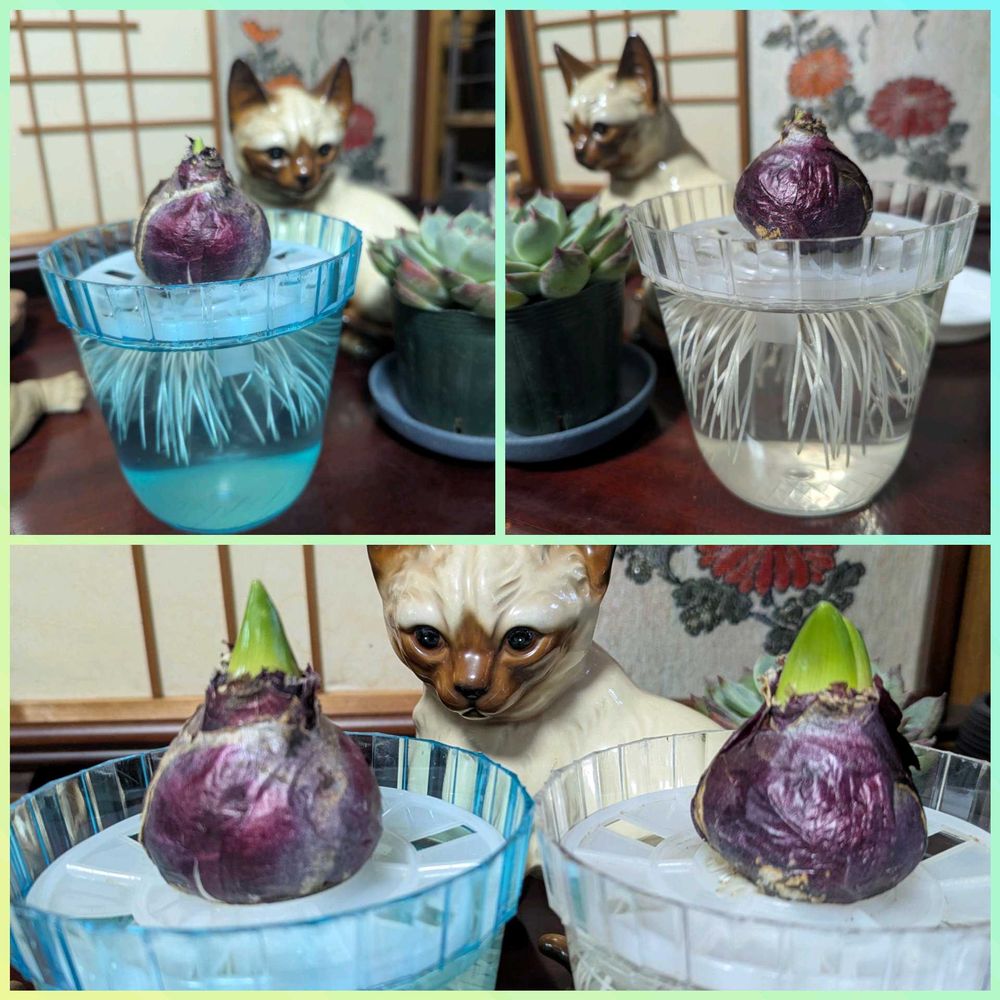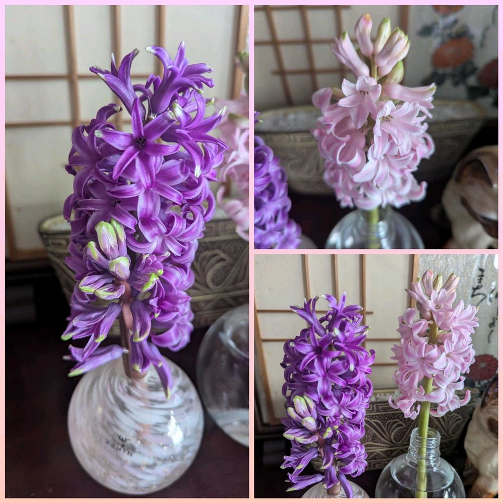 ①〜③昨年11月から始めたヒヤシンスの水耕栽培。コラージュしてみました。