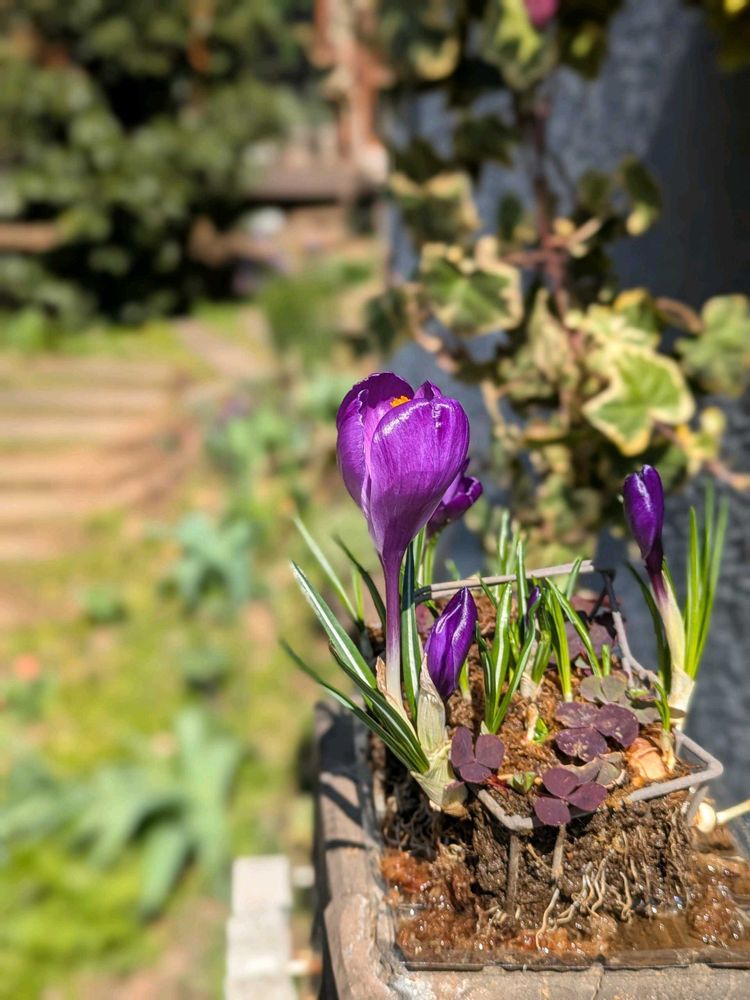 ワイヤー製のカゴに詰めた水苔で育てていたクロッカスがやっと咲きました。