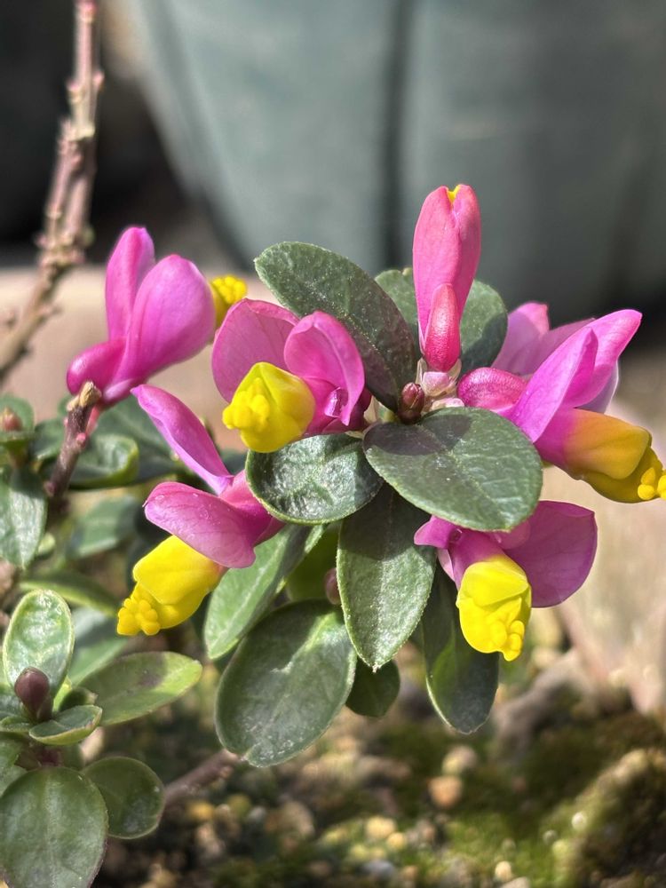 「常盤姫萩(ときわひめはぎ)」は、ヨーロッパ中部~イタリア原産の常緑小低木で、春先に萩の花に似た形の花を咲かせます。赤紫色と黄色のポップな色合いがとっても目立ち、香りも良いので、花の頃には周辺に甘い香りが広がります。こんもり育ちますので花壇の縁取りや、グランドカバーにもおすすめです。学名「ポリガラ・カマエブクスス」