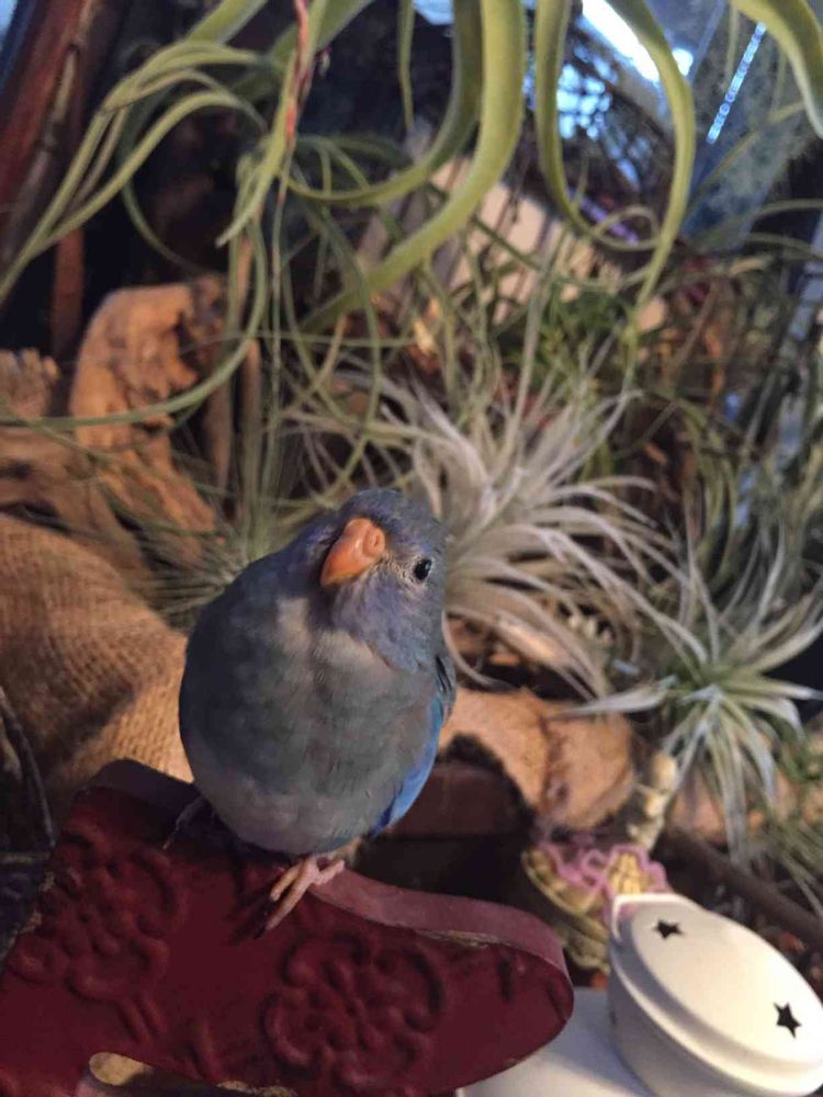色は、サザナミインコのコバルトに似ていますね。波模様は全くありませんが…薄い水色も羽に入っていますよ。(^ ^)