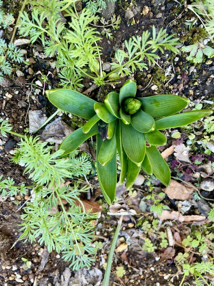 >葉っぱのお布団暖かく…早く咲く🦆さん