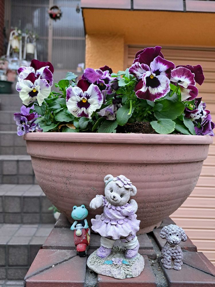 フリルのパンジーもりもりだわ。熊のバレーリーナーカエルがバイクに、乗ってトイプードル小さなオブジェ集めるのも楽しいね。💕