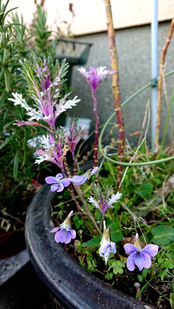 3年目のミニ葉牡丹の鉢にスミレの花が咲いていました❗