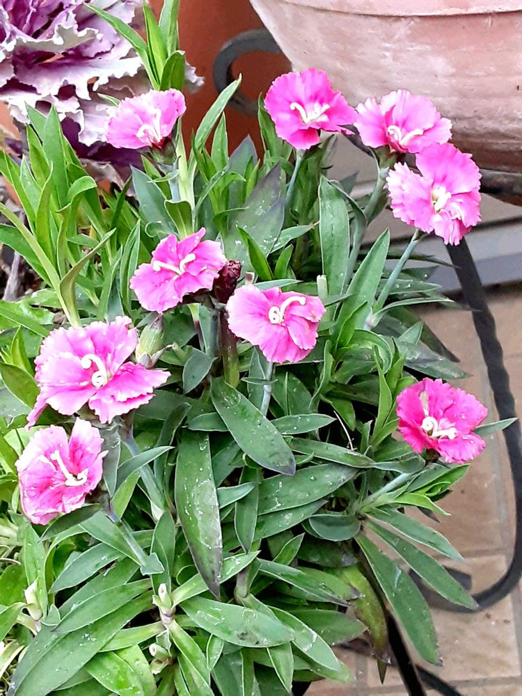寄せ植えにしていたら大きくなり過ぎたので、半分に株分けした残りのナデシコです。