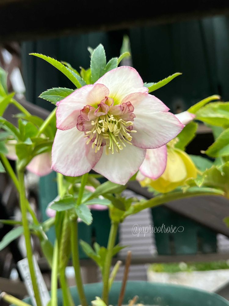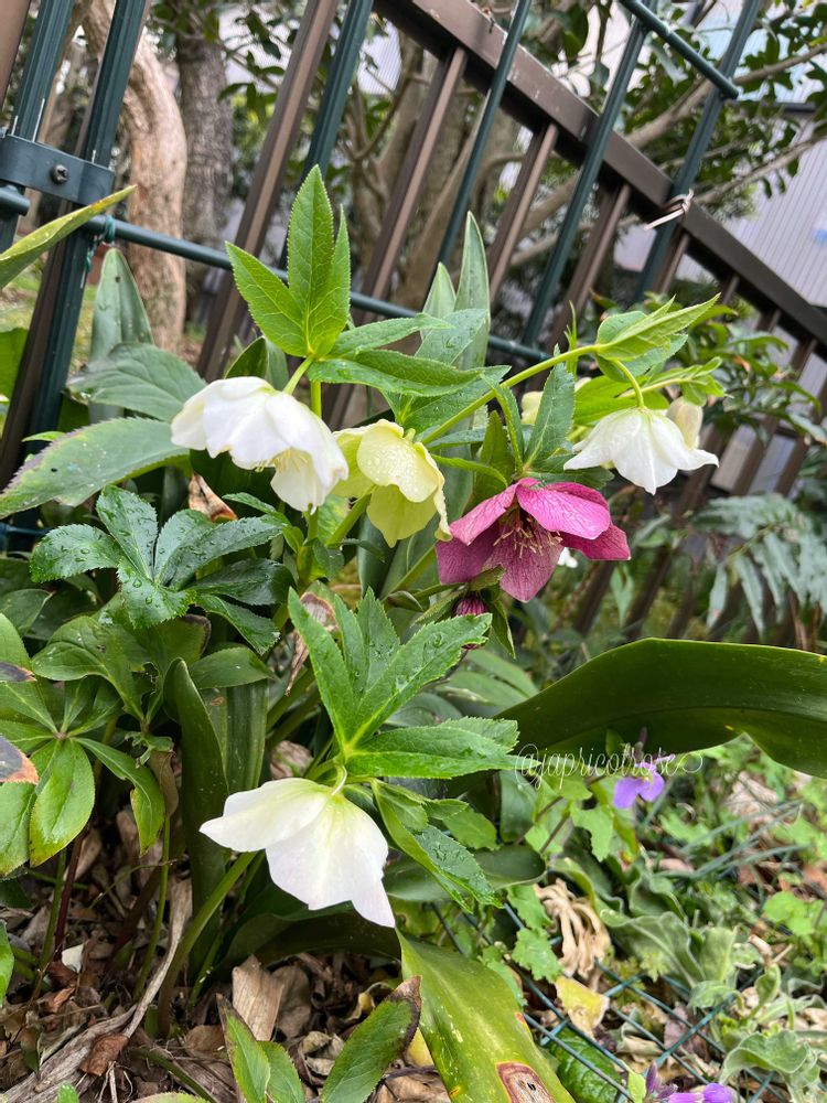⑤フェンスの足元にはこぼれ種からいろいろなクリスマスローズがブーケみたいに咲いています✨