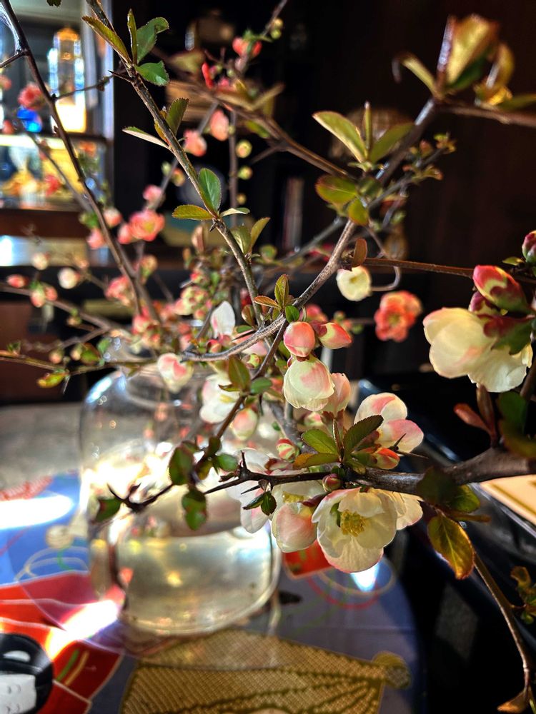 お気に入りの喫茶店で ボケの花がキレイに飾られてました。😄