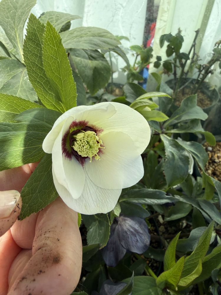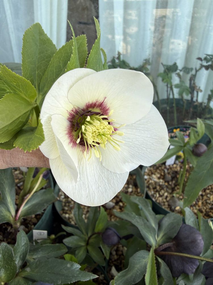 今ごろやっと咲いてきたクリスマスローズ。野田園芸のホワイトフラッシュです。