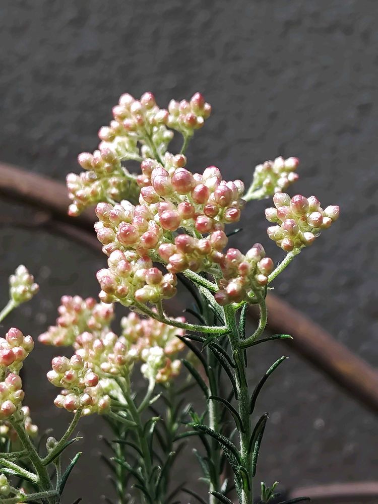 ②ピンク色のライスフラワーの蕾のつぶつぶが春の光にきらきら