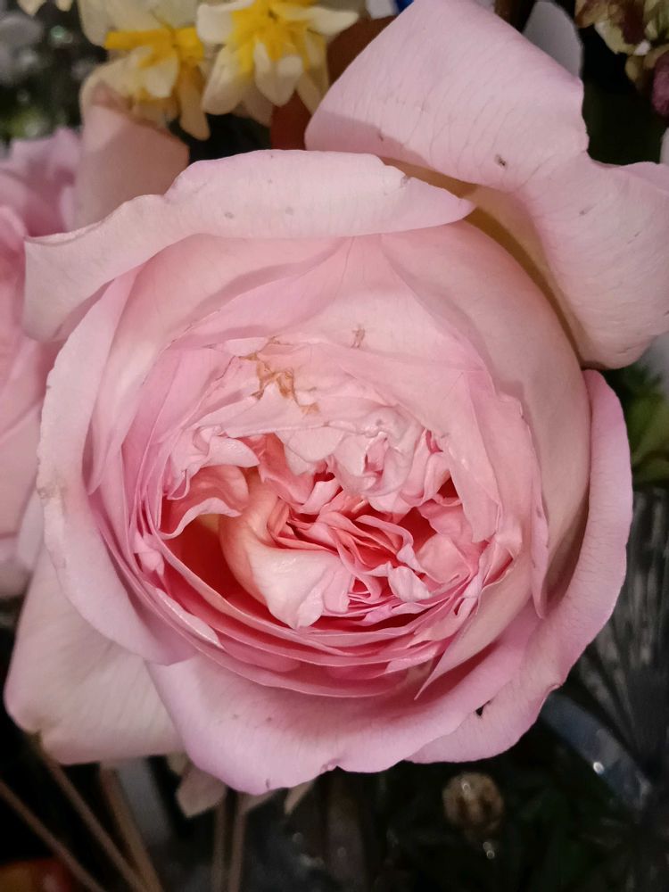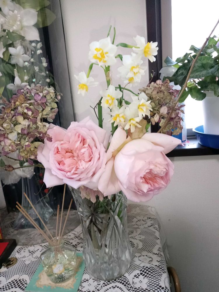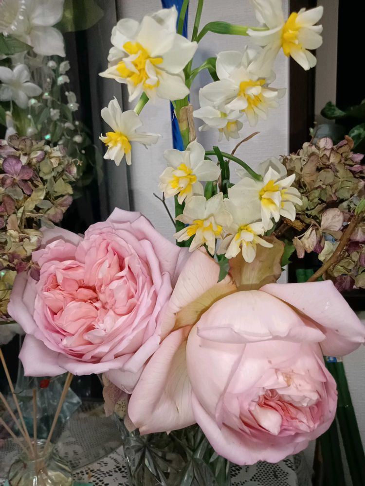 薔薇の剪定は終わりましたが…蕾だけ残してたら気温上昇で開花して来ました〜早めにカットしてお庭の水仙と飾りました〜相変わらず良い香りがします✨️💞🤍💗💛🩷🌹