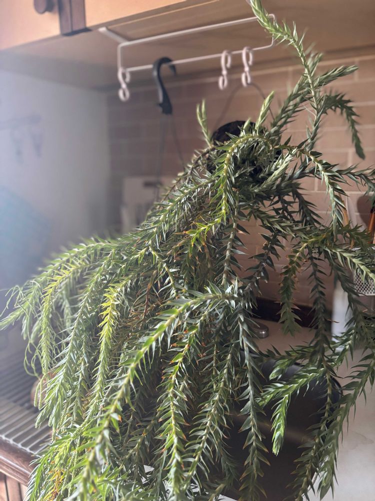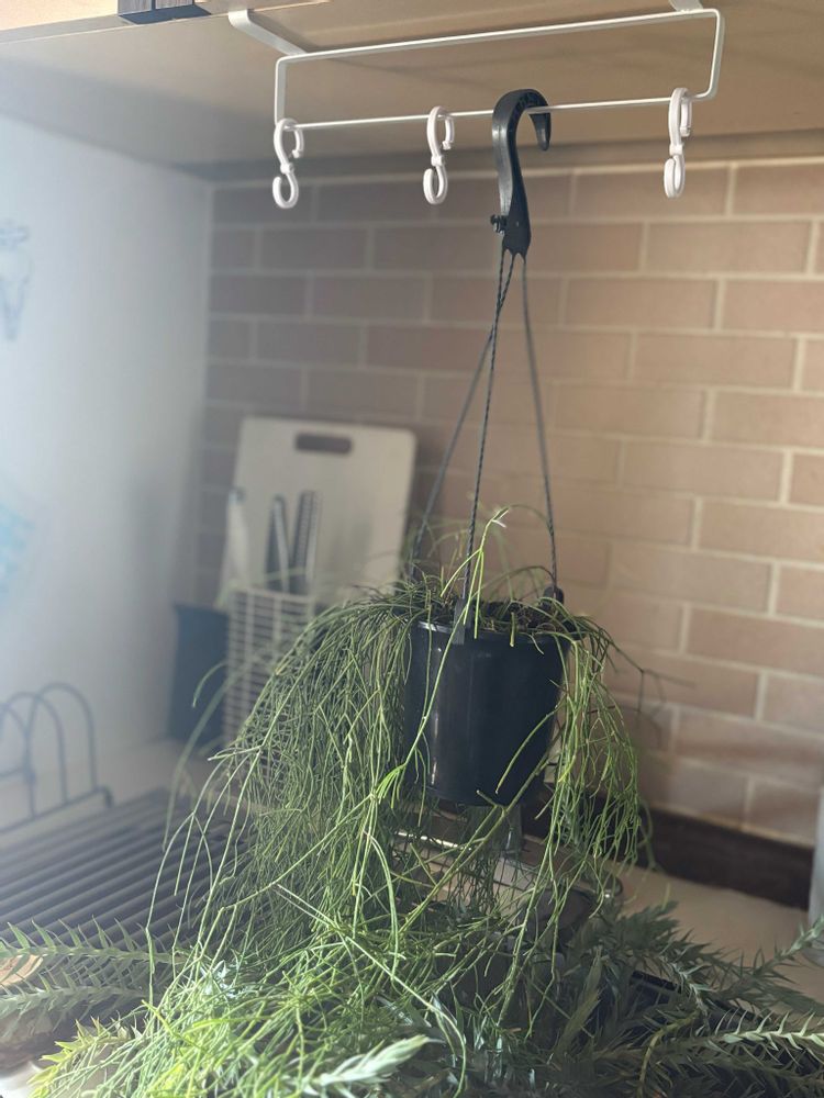 狭いキッチンですが、ダイニングの吊り鉢の水やりはキッチンでしてます。水を切るためにこうして暫く吊り下げてます。みんな受け皿の無い吊り鉢はどこで水やりしてるのだろう🚿